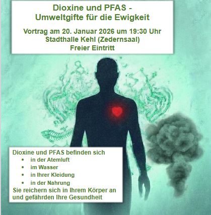 Der Vortrag „Dioxine und PFAS – Umweltgifte für die Ewigkeit“ beginnt am 20. Januar 2026 um 19.30 Uhr im Zedernsaal der Stadthalle Kehl. Dioxine und PFAS gehören zu den langlebigsten