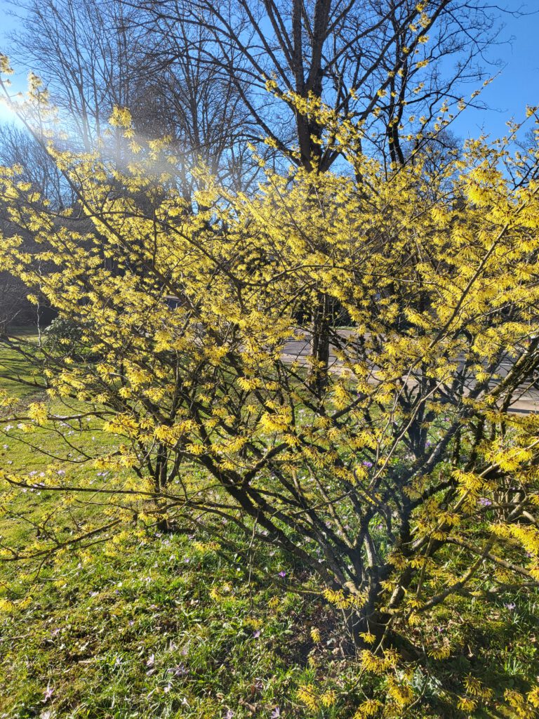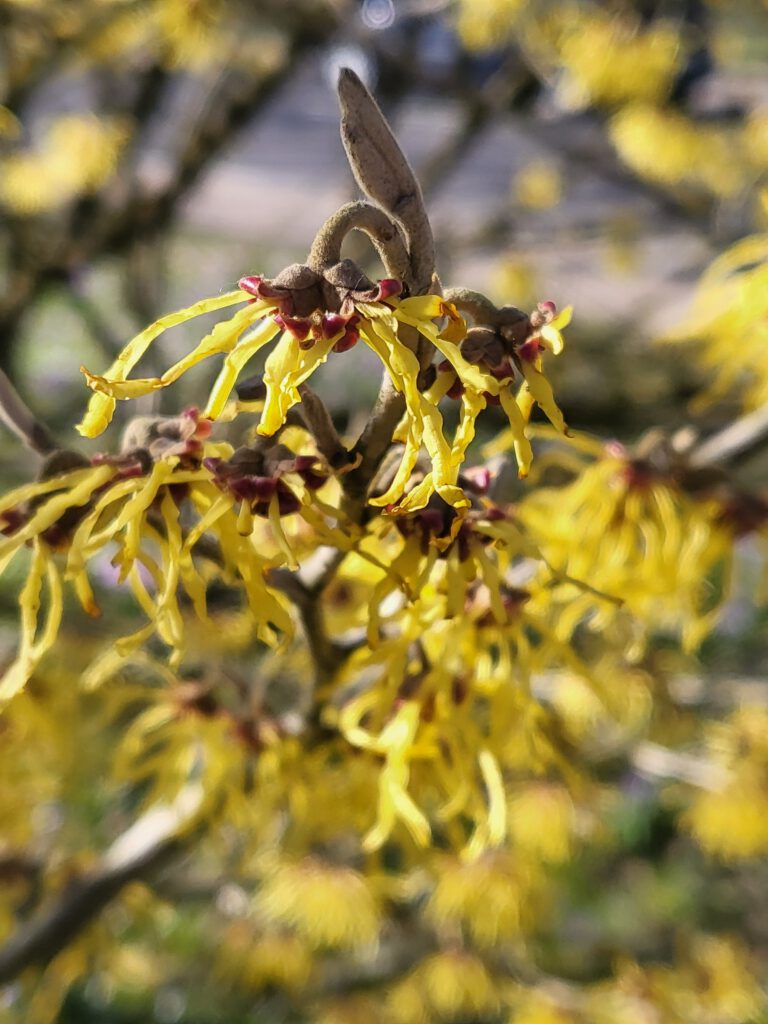 Ihre größten Zauberkräfte entfalten aber ihre leuchtend gelben oder je nach Sorte auch orangeroten Blütenbüschel, die auch leicht duften, im winterlich kahlen Garten. Die Zaubernuss benötigt einen windgeschützten Standort. Ideal sind ein humoser und eher feuchter Boden mit leicht saurer Erde. Da sie langsam wächst, sollte man sie nicht zurückschneiden. Als Heckenpflanze ist sie ungeeignet, da sie keine Wurzeldruck verträgt und wird am besten als Einzelstrauch gepflanzt. Im Laufe der Zeit wird sie bis zu drei Meter hoch und fast ebenso breit. Die größte Wirkung entfalten ihre Zauberblüten vor einem dunklen Hintergrund – so wie am Kehler Altrhein nahe der Mediathek.
