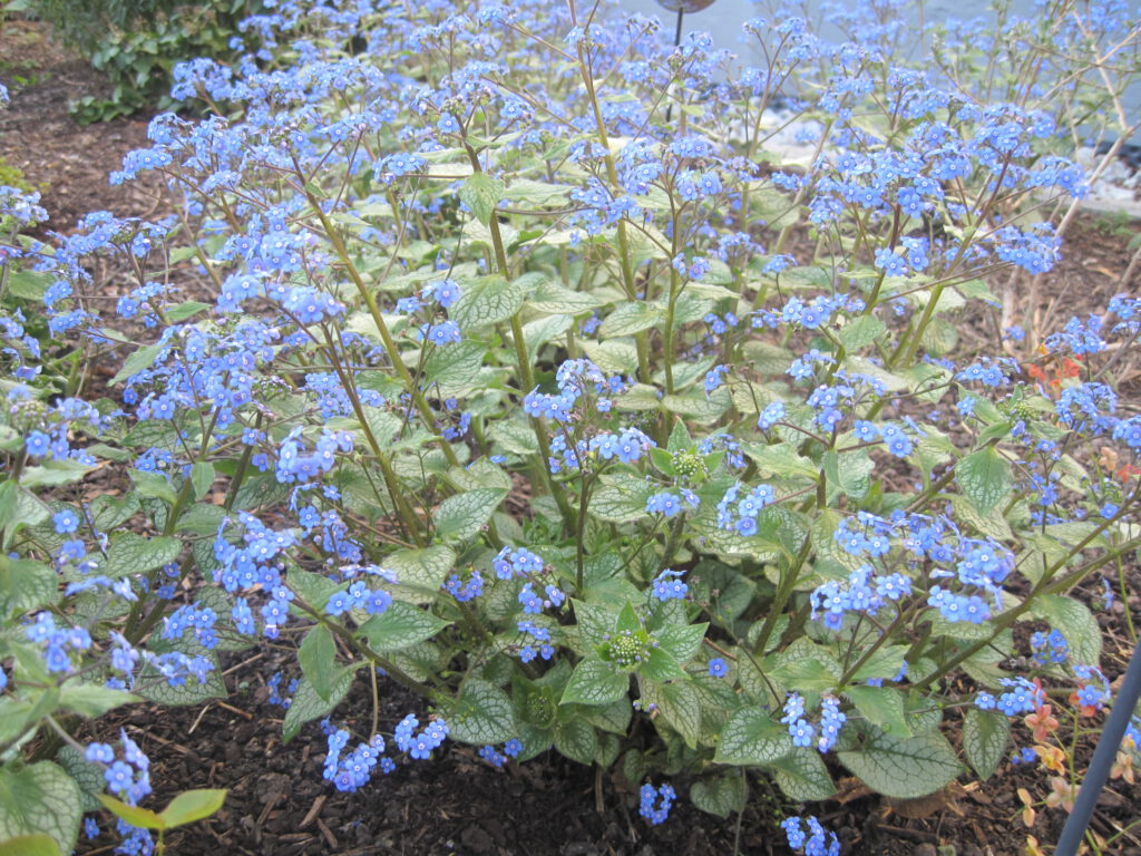Mittlerweile kann man auch viele Sorten des Kaukausus-Vergissmeinnichts (Brunnera macrophylla) kaufen, deren Blüten unserem heimischen zum Verwechseln ähnlich sehen. Es handelt sich um Stauden mit bis zu 50 Zentimeter Wuchshöhe, die mit den Jahren im Beet recht breit werden können und sich deshalb als Bodendecker eignen. Oft haben die recht großen Blätter auffallende weiße Aderungen, zum Beispiel die Sorte ‚Jack Frost‘. Es benötigt einen nicht zu sonnigen und vor allem nicht zu trockenen Standort – dann muss man es höchstens in sehr heißen Sommern ein wenig gießen. Spätestens nach dem ersten Frost sterben die oberirdischen Pflanzenteile ab. Auch nach strengen Wintern treibt das Kaukausus-Vergissmeinnicht zuverlässig wieder aus – die kennt es schließlich aus seiner Heimat.