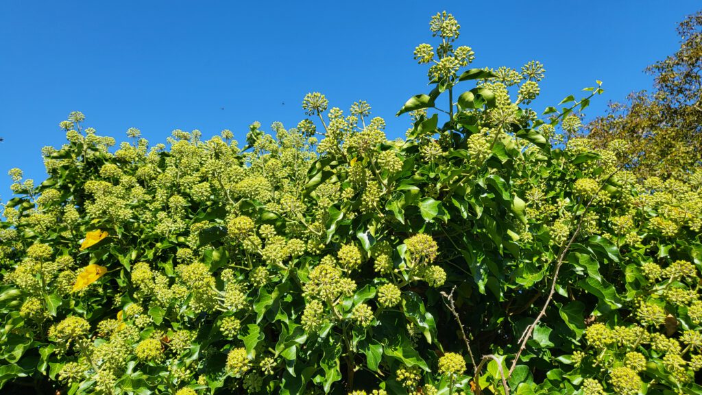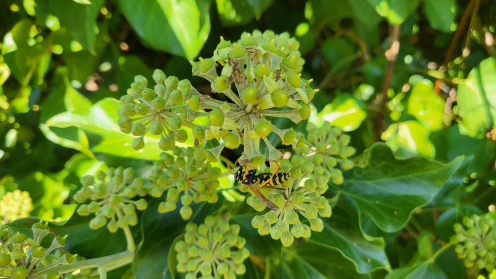 Ungewöhnlich ist die Blütezeit aller Efeuarten: die grüngelben, leicht duftenden Dolden öffnen sich erst ab September und versorgen vor allem Honigbienen mitunter bis November mit Nektar. Unverzichtbar ist sein Pollen für die Efeu-Seidenbiene, die als spezialisierte Wildbienenart ihre Brut nur hiermit versorgen kann. Auch Schwebfliegen, Schmetterlinge und harmlose Wespenarten wie Feldwespen schätzen ihn als späte Futterquelle, während seine Blätter von einigen selteneren Schmetterlingsraupen gefressen werden. Ab Januar färben sich seine – für uns giftigen – Beeren schwarz und ernähren Amseln und andere Vögel. Sie brüten auch gern in dem dichten und tiefen Bewuchs, den er an Fassaden nach vielen Jahren bildet. Anders als oft angenommen wird, schadet er intaktem Mauerwerk übrigens nicht. Seine Triebe dringen allerdings in Ritzen ein und können unter Dachpfannen kriechen, weshalb man dies regelmäßig kontrollieren und in rund um Fenster und am Dach zurückschneiden sollte.
