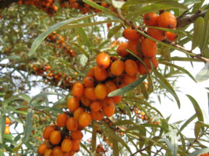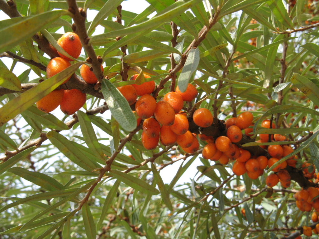 Der Sanddorn (Hippophae rhamnoides) wanderte während der Eiszeit von Asien nach Mitteleuropa ein- Heutzutage findet man ihn wild fast nur noch an den Küsten von Nord- und Ostsee und als Pioniergebüsch an sandigen Flussufern oder Kiesgruben. Er verträgt keinen Schatten und wächst am besten in tiefgründigem lockerem Boden. Durch ausladenden Wuchs und Ausläufer bildet er dichte Gebüsche, in deren dornigen Zweigen Vögel geschützt brüten können. Deshalb sollte man ihn nur in große Gärten pflanzen und eventuell eine Wurzelsperre einbauen. Seine dekorativen Beeren reifen ab dem Spätsommer und enthalten viel Vitamin C. Sie lassen sich zu Saft, Likör oder Marmelade (zum Beispiel zusammen mit Hagebutten) verarbeiten. Da dieser Großstrauch zweihäusig ist, benötigt man zur Fruchtbildung ein männliches und mindestens ein weibliches Exemplar. Da die Beeren sehr fest am dornigen Ast hängen, schneidet man die Zweige zum Ernten ab und legt sie für eine Weile ins Gefrierfach. Danach lassen sich die Beeren leicht lösen.